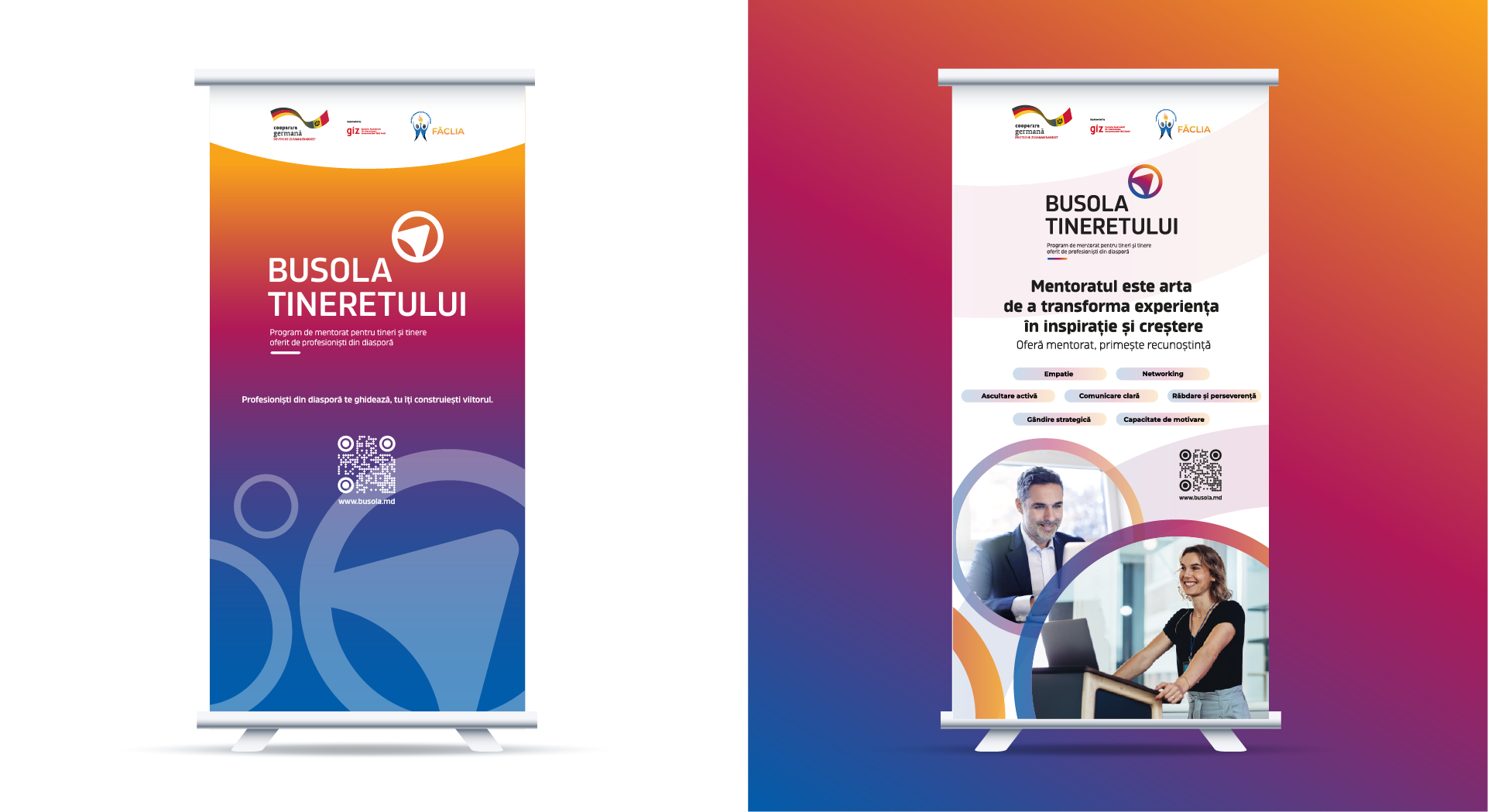 Background proiect: Lansare și dezvoltare naming si identitate vizuală pentru programul național de mentorat „Busola Tineretului”, implementat de AO „Făclia” cu sprijinul proiectelor GIZ Moldova – „Fondul de consiliere în politici” și „Promovarea angajării tineretului în Moldova”, finanțate de Ministerul German pentru Cooperare Economică și Dezvoltare.