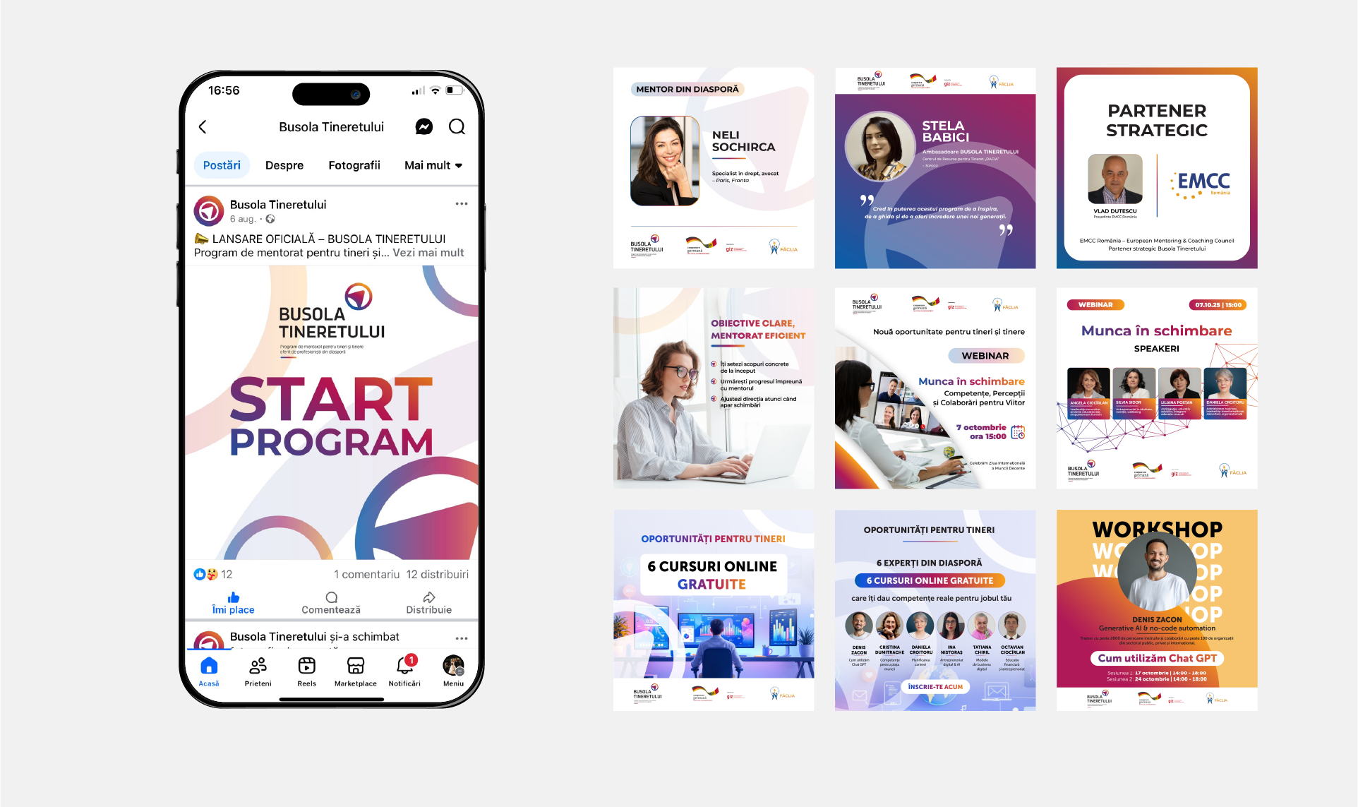 Brief: Crearea unei identități vizuale și a unei prezențe digitale care să exprime ideea de ghidare, încredere și dezvoltare personală. Logo-ul și materialele asociate trebuie să transmită clar conceptul de „direcție” și „mentorat” – o busolă care orientează tinerii spre cariera potrivită – și să funcționeze coerent în toate formatele de comunicare: online, print, video.